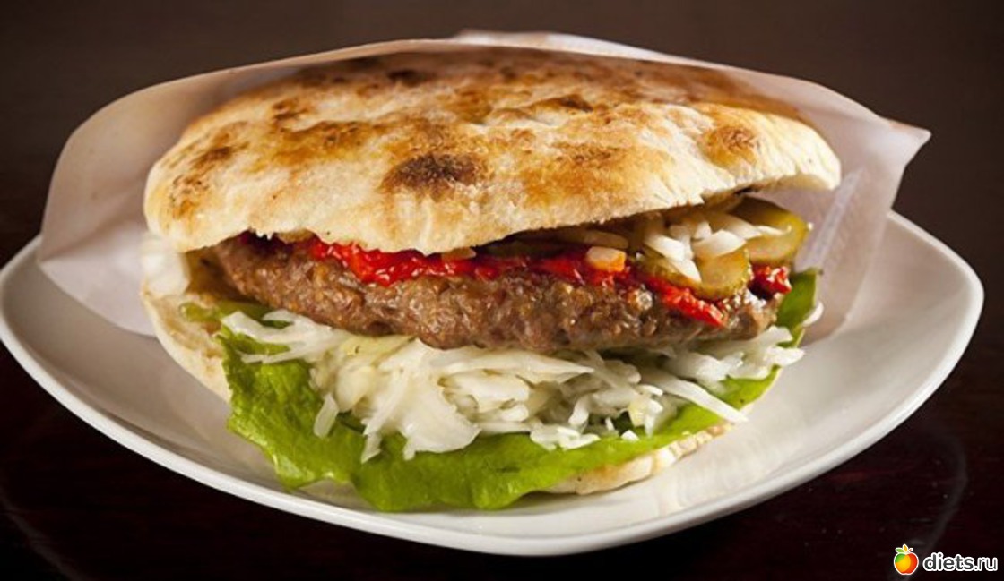 Плескавица: сэндвич с разными видами мяса. Подаётся на лаваше или круглой булочке с сербскими сливками и перечным соусом.