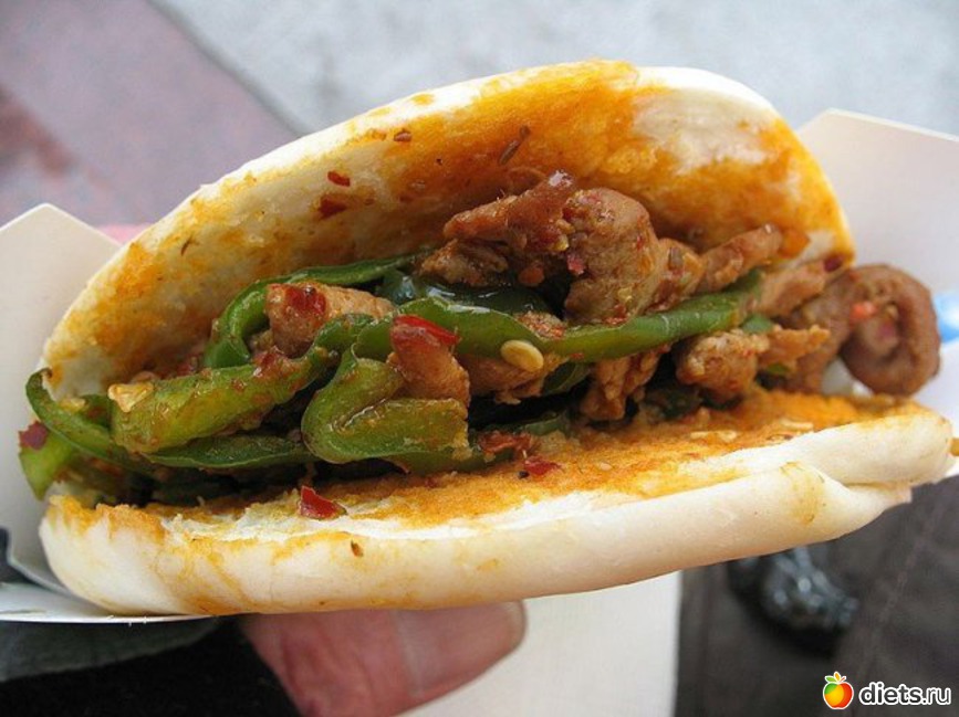 Донки бургер: хрустящая булочка под названием "хуочао" с добавлением ослиного мяса, латука, перцев.