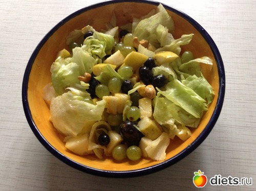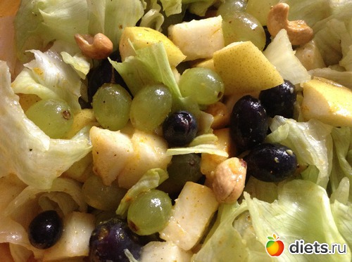 Завтрак - приготовила себе к кофе салат из айсберга, винограда, груши и орехов кешью (заправлен карри, лимонным соком, маслом, горчицей):