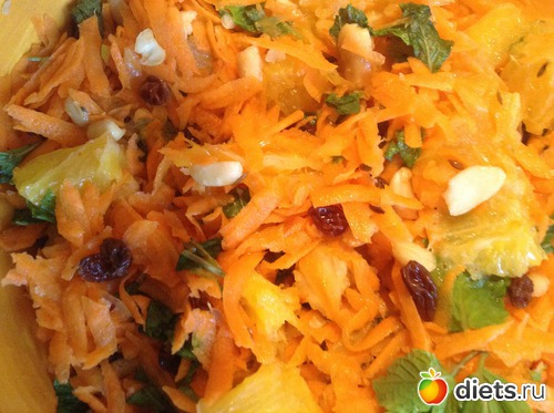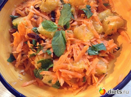 Как приготовить: Замочить изюм в воде на 30 минут, затем воду слить. Морковь вымыть, натереть на крупной терке, выложить в большую чашу. Добавить апельсин, порезанный кубиками и слегка обжаренный, орехи, изюм и листья мяты. Для заправки смешать лимонный сок, мед, масло, добавить зиру, соль и перец, хорошенько перемешать. Заправить пряной смесью салат, поставить в холодильник на 30 минут.