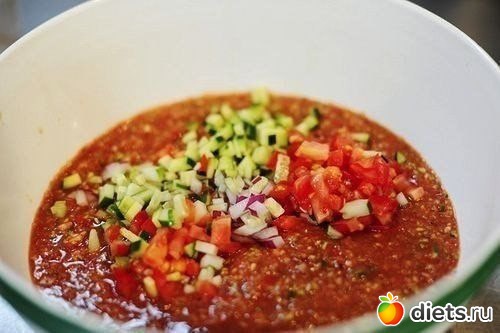 - Вылить в большую миску и добавить остальную часть томатного сока, половина из оставшихся лук, огурцы, помидоры, кабачки и сельдерей. (Оставьте немного нарезанных овощей для гарнира.)