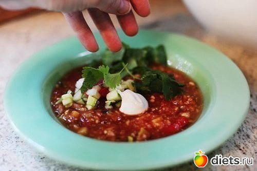 - Проверьте приправы в последний раз. Налейте в тарелку гаспачо и украсьте остальными нарезанными овощами, кусочек свежего авокадо, сметана, и кинзой.