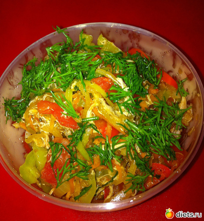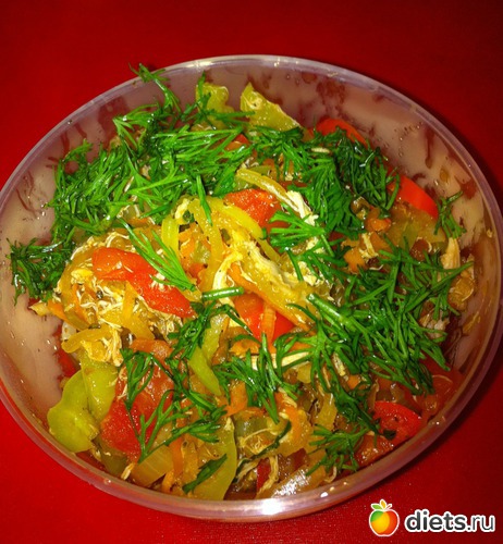 Томаты - кубиками, морковь на терке, перец и лук полукольцами.