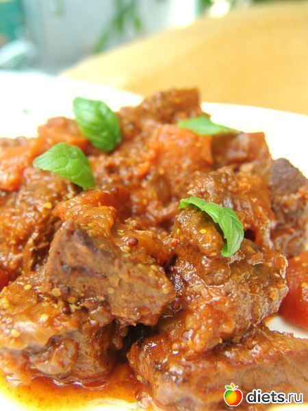 4. Соединить томатный сок с горчицей, влить к мясу, посолить, поперчить, добавить лавровый лист, присыпать сахаром, не перемешивать.