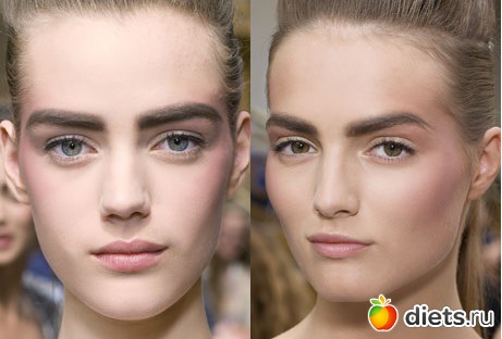 Во втором варианте nude face разбавили румянцем. На фоне бледной кожи румяна холодных оттенков освежают образ. Эффект в стиле «только что с мороза» или «я немного смущена» создали визажисты на показах Stella McCartney, Chanel и Valentino.