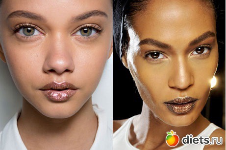 Подчеркнуть полученный за время летнего отпуска загар – самый настоящий тренд осенне-зимнего сезона. Используйте в макияже бронзанты, пудры с эффектом загара, наносите их на скулы, лоб по линии роста волос. Красоту губ подчеркните помадой или блеском с мерцающими золотистыми частичками.