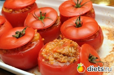 3. Выложи начинку в бочонки помидоров, накрой верхушками и помести в форму для запекания. Сбрызни оливковым маслом и запекай в течение 15-20 минут при температуре 200 oС.