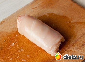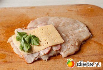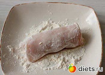Солим и перчим филе. Кладем ветчину, сыр и петрушку. Сворачиваем в рулетик. Обваливаем в муке. Макаем в слегка взбитые с солью яйца.