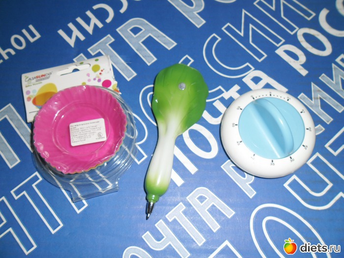 Кухонно-кондитерские штучки - таймер механический, формочки для кап-кейков и ручка-магнит в виде пучка сельдерея или листа салата (не поняла кто именно