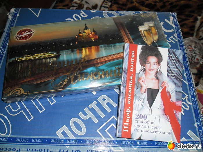 Еще сласти - коробка шоколадных конфет и полезная книга - "Шарф, косынка, платок". Есть у меня пара палантинов, шарфиков шифоновых, шаль самовязная - буду осваивать премудрости изысканного ношения этих элементов дамского гардероба