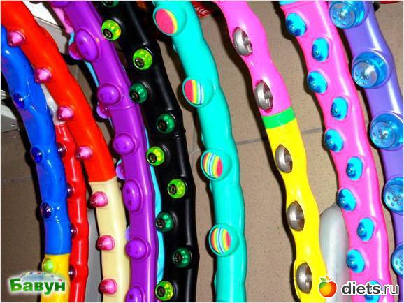 4. Наиболее востребованный - массажный обруч, с внутренней стороны которого расположены массирующие шарики, «пальчики» или «ребрышки», которые активно массируют область живота и талии и тем самым избавляют от жира и целлюлита.