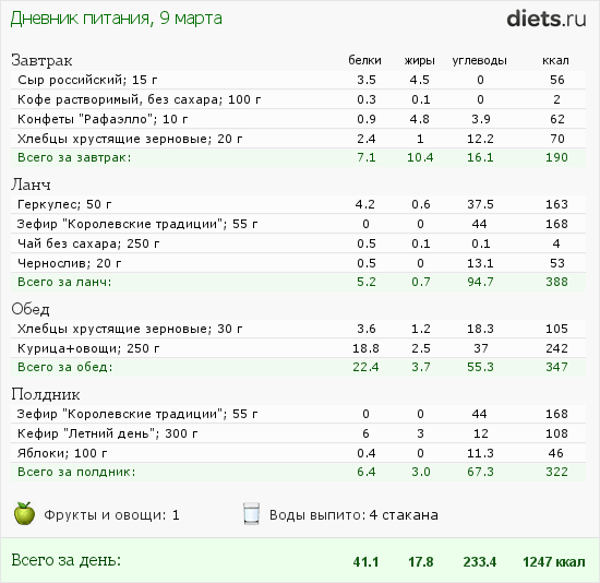 Время еще 3 часа, а уже почти 1300 ккал и еще сегодня спорт. На ужин будет творог и молоко.