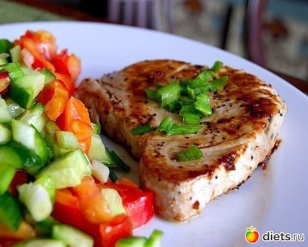 Подавайте тунца с овощным салатом, украсив мелко нарезанным зеленым луком.