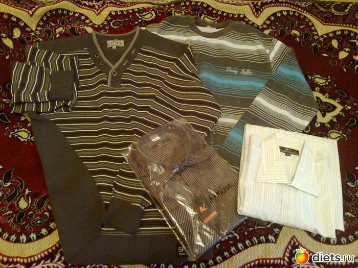 Мужу пару свитеров и рубашки и еще галстук полосатенький такой