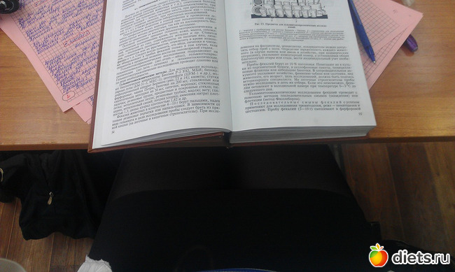 сумка текстильная под столом, тетрадку с аккуратными записями и книгу с неинтересными картинками.