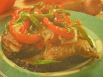 МОРСКОЙ  ОКУНЬ  С  ОВОЩАМИ ПРОДУКТЫ:Филе окуня 700гр, Крахмал-2ст ложки. масло растительное 4ст. ложки.2 баклажана.2 томата.1сладкий перец. цедра1лимона. чёрный молотый перец. соль. ПРИГОТОВЛЕНИЯ:Баклажаны нарезать кружками, посолить, запанировать в крахмале и обжарить. Филе окуня нарезать на порции, посыпать солью и перцем, запанировать в крахмале и обжарить. Цедру лимона пассеровать на растительном масле. Перец вымыть, удалить плодоножки и семена, тонко нарезать, и обжарить слегка в месте с лимоном, Томаты нарезать кружками. Баклажаны выложить на блюдо, поверх них разместить филе окуня, Покрыть рыбу кружками томатов, сверху выложить поджаренный с лимонной цедрой сладкий перец.