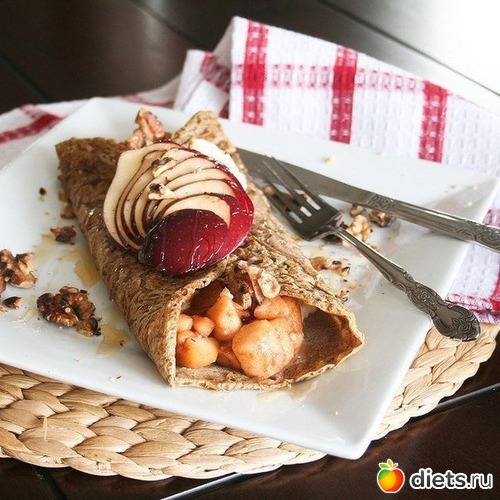 Положите блин на тарелку, в середину выложите примерно ½ стакана творога низкой жирности, сверху – приготовленные яблоки. Заверните блин.