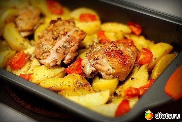 100 гр окорочка (185) + 100 гр картошки (80) + 50 гр помидоров (10) получаем 275. Это калорийность 250 гр еды. то есть делим на 2,5