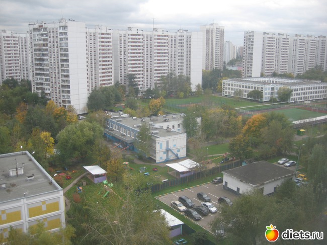 С одной стороны у меня открывается вид на десятиэтажки, подобные той, где живем мы сами, а также на школьный стадион- любимое место для прогулок всех местных ребятишек и мамочек с колясками