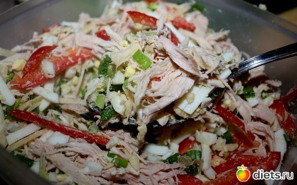 Индюшку отвариваем, остужаем и рвём руками на волокна, перчик режем тонкой соломкой, режем лук и яйца, сыр трём на тёрке, всё смешиваем, заправляем