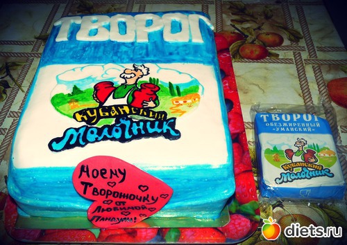 Парень лучшей подруги очень любит творог, причем конкретный и конкретного производителя.- Обезжиренный от "кубанского молочника". И подруга решила порадовать своего парня необычным тортиком и предложила сделать торт в виде пачки творога. Мне показалось это очень интересным и с радостью согласилась) Конечным результатом я не очень довольна, в основном некоторыми деталями довольна, а в целом тортом нет. В общем торт внутри творожный кекс пропитанный ананасовым сиропом с творожным кремом и кусочками консервированного ананаса и везде любимый творог именинника. Получилось вкусно, а вот на вид смотрите сами) (Фото от заказчика)
