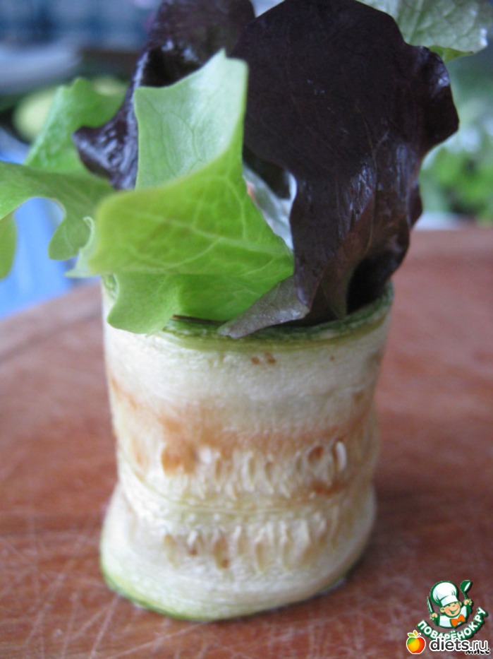 Берём обжаренную полосочку кабачка. На край кладём несколько листиков салата, чтобы они "торчали сверху", кладём ложку овощей, и опять несколько листиков салата и заворачиваем.