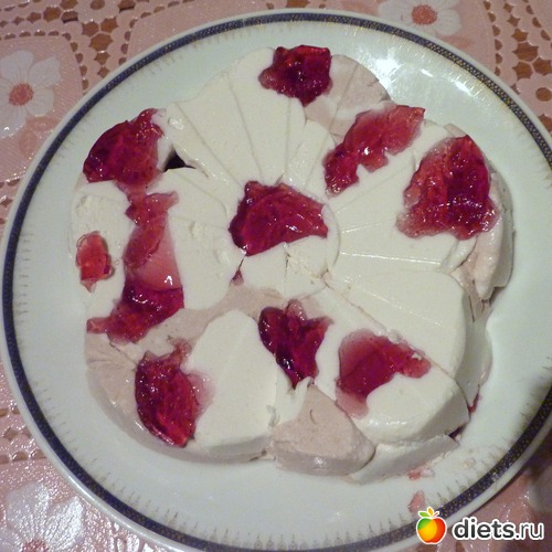 В форму положить кусочки желе, сверху залить половиной творожной массы. Во вторую половину массы добавить какао и ещё раз взбить. На белую массу положить ещё несколько кусочков желе и залить "шоколадно-творожной массой.