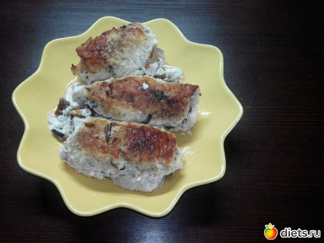 Идея стара как мир и проста как куриное яйцо, но вдруг кому-то будет полезен этот рецепт. Ингредиенты: филе индейки или курицы, лесные грибы или любые другие, лук репчатый, молоко обезжиренное, йогурт натуральный пониженной жирности. Грибы и лук мелко режем и обжариваем на сковороде по желанию с небольшим количеством масла, солим-перчим. Филе птицы нарезаем на куски максимально большой площадью толщиной 0,5-1 см., хорошенько отбиваем, солим-перчим. В мясо заворачиваем грибы, скреплять ничем не надо, рулетики хорошо держат форму. Выкладываем в форму для запекания. Молоко смешиваем с йогуртом, опять же по желанию солим-перчим, если остались грибы с луком, добавляем их туда же, все хорошо перемешиваем и заливаем рулетики. Запекпем минут 40-50 при температуре 180° до образования аппетитной корочкой. Все ингридиенты "на глаз". Очень вкусно с дюкановским майонезом. Не пойму почему, но уловила вкус пельменей