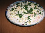 Отварить картофель в мундире, морковь и яйца. Запечь свёклу (либо отварить). Отварить филе. Мелко порезать лук и замариновать в натуральном уксусе. Кубиками порезать огурцы. Подготовить сметанный соус для заправки салата согласно рецепта (всё нужно пробовать, также можно изменить рецептуру на свой вкус).