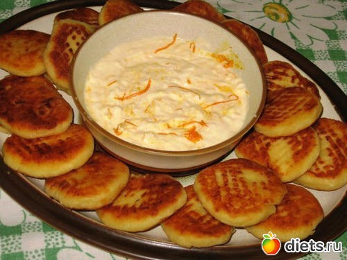 С половины апельсина снять цедру и выдавить 2 столовые ложки сока. В глубокой миске (а лучше в процессоре) смешать творог, сахар, яйцо, сметану, цедру и сок апельсина. Постепенно добавить муку и вымесить некрутое тесто. Из теста можно скатать шарики-заготовки или разделить тесто на батоны, с которых нарезать круглые заготовки для сырников. С помощью вилки расплющить их в лепешки. Выкладывать на разогретую сковородку с растительным маслом и жарить до золотистого цвета на умеренном огне. Для соуса отрезать два круглых ломтика от апельсина и мелко порезать их вместе со шкуркой. Потом измельчить в блендере с сахаром и смешать со сметаной. Добавить цедру, снятую с оставшегося апельсина.