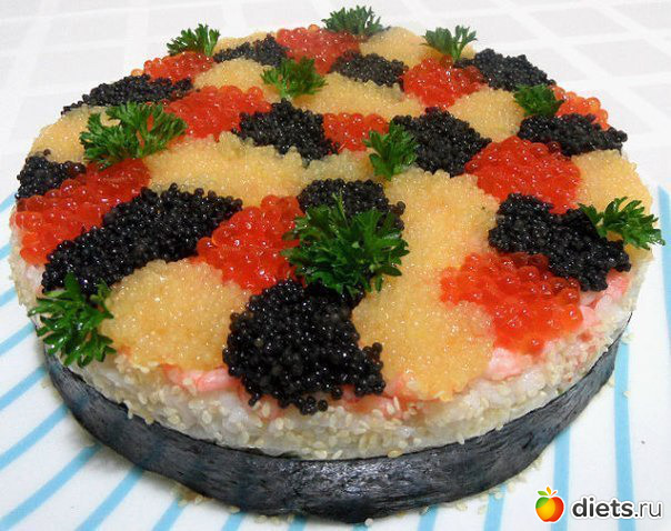 Перевернуть на блюдо, снять бортики, снять дно формы, выложить икру, листочки петрушки, по кругу выложить нори, посыпать кунжутом. Когда кусочек торта уже на тарелочке – полить соевым соусом