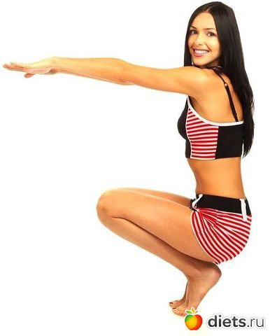 Встать прямо, ноги шире плеч, бедра и стопы развернуть на 45°. На вдохе присесть вниз, не наклоняя корпус и не изменяя положение колен. На выдохе подняться. Повторить 16–25 раз.