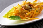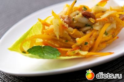 Тыкву, яблоки и морковь уложить в миску. Добавить лимонную цедру, лимонный сок с медом и хорошо перемешать. Салат горкой уложить в салатницу. Украсить салат из тыквы зеленью и грецкими орехами.