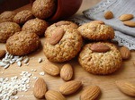 Сушеную вишню замочить в 20 г апельсинового сока на час, после чего измельчить в блендере. Измельчить 100г миндаля (не в муку, но достаточно мелко), добавить овсяные хлопья, добавить сахар, семечки, кунжут, ржаную муку, все перемешать и добавить растительное масло, стевию, измельченную вишню, сок апельсина, все хорошо перемешать, сформировать шарики по 25 г, немного приплюснуть, выложить на пергаментную бумагу на расстоянии друг от друга, сверху каждого печенья разместить орешек или семечки, выпекать в разогретой духовке при 180 градусах 15-17 минут до зарумянивания, печенье достать и дать немного остыть на противне.