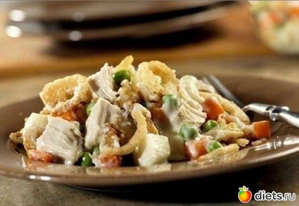 4. Смешать филе, лук с грибами, яйца и горошек. Заправить йогуртом и перемешать.