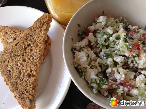 Завтрак - апельсиновый фреш (1 кулак фруктов), тост зерновой (1 кулак углеводов), творог (1/2 кулака белков) с овощами (1 кулак), кофе: