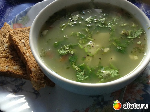 Обед - суп из шпината с зерновым тостом (1 кулак углеводов + 1 кулак овощей) и яичком вкрутую, а еще ломтик бастурмы (1/2 кулака белков):