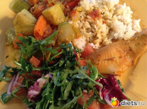 Ужин - тилапия на пару (1/2 кулака белков), кабачки с морковкой и руккола (1 кулак овощей), рис на пару (1 кулак углеводов), чай: