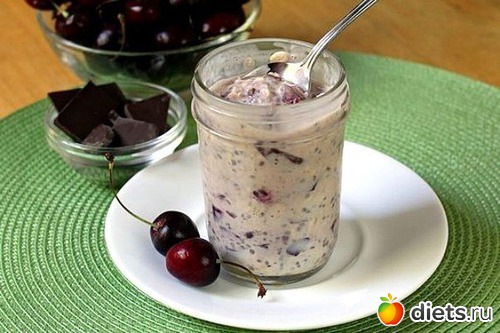 В банку добавляем овсянку, кокосовое молоко, йогурт, мёд и ванилин. Закрываем крышкой и хорошо встряхиваем, пока все ингредиенты не смешаются. Открываем, добавляем кусочки нарезанной вишни, а также шоколадную крошку и аккуратно всё перемешиваем. Закрываем крышкой банку и ставим в холодильник на ночь (хранить до 3 дней). Едим овсянку охлажденной.
