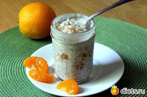 В банку добавляем овсянку, молоко, йогурт, апельсиновый джем и мёд. Закрываем крышкой и хорошо встряхиваем, пока все ингредиенты не смешаются. Открываем, добавляем кусочки осушенных нарезанных мандаринов и аккуратно размешиваем. Закрываем крышкой банку и ставим в холодильник на ночь (хранить до 3 дней). Едим овсянку охлажденной.