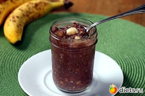 В банку добавляем овсянку, молоко, йогурт, какао-порошок и мёд. Закрываем крышкой и хорошо встряхиваем, пока все ингредиенты не смешаются. Открываем, добавляем кусочки нарезанных спелых бананов и аккуратно размешиваем. Закрываем крышкой банку и ставим в холодильник на ночь (хранить до 2 дней). Едим овсянку охлажденной.