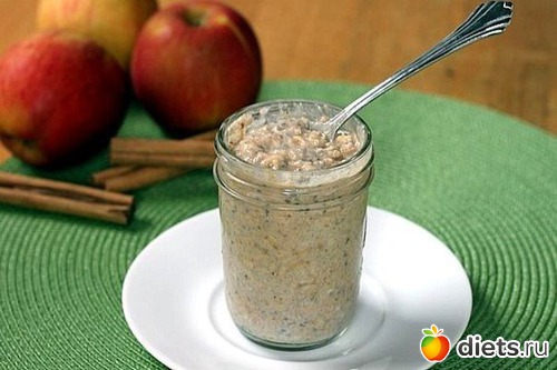 В банку добавляем овсянку, молоко, йогурт, корицу и мёд. Закрываем крышкой и хорошо встряхиваем, пока все ингредиенты не смешаются. Открываем, добавляем яблочное пюре (при желании можно добавить и кусочки свежего яблока) и аккуратно размешиваем. Закрываем крышкой банку и ставим в холодильник на ночь (хранить до 2 дней). Едим овсянку охлажденной.