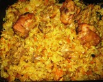 Потом добавила рис, залила его водой (на 1 см выше уровня риса) + приправы. Накрыла фольгой, 230 гр., 35-40 мин. Все)