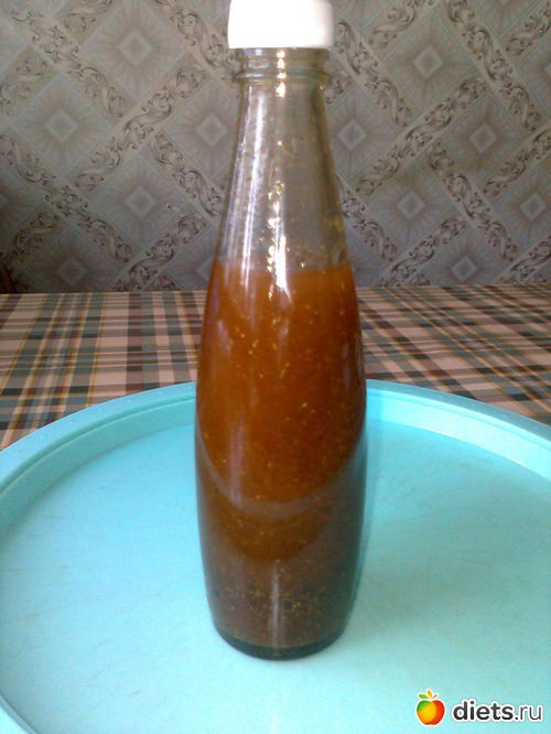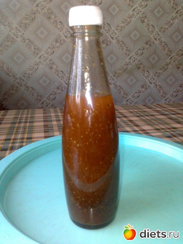Бутылочку закупорить и хорошо потрясти, чтобы растворились соль и сахар. А также чтобы весь раствор стал однородным. Так делать (перемешивать) надо перед каждой заправкой салата, так как содержимое бутылки расслаивается. Хранить заправку в холодильнике.