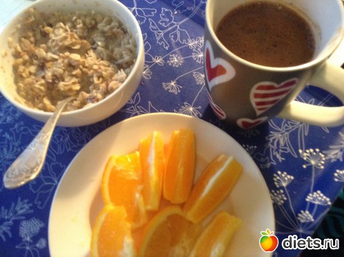 Завтрак - каша "5 злаков" (1 углеводы, 1 белок), апельсин (1 фрукты), кофе: