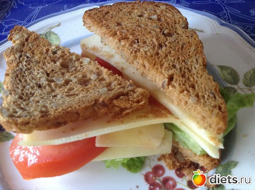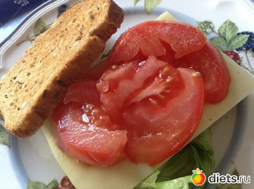 Ланч - тост с сыром, помидором и листьями салата (1 углеводы, 1 овощи, 1/2 белка) - в разобранном и собранном виде: