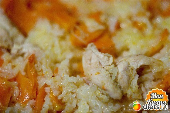 3. Чашка риса промывается и отправляется на некоторое время обжариваться вместе с овощами и мясом. Немного соли и добавляем в 3и раза больше воды чем объем риса, или 2е, если нужен рис более сухой.