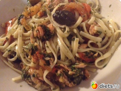 Ужин - лапша с семгой, шпинатом, помидором, оливками, чай: