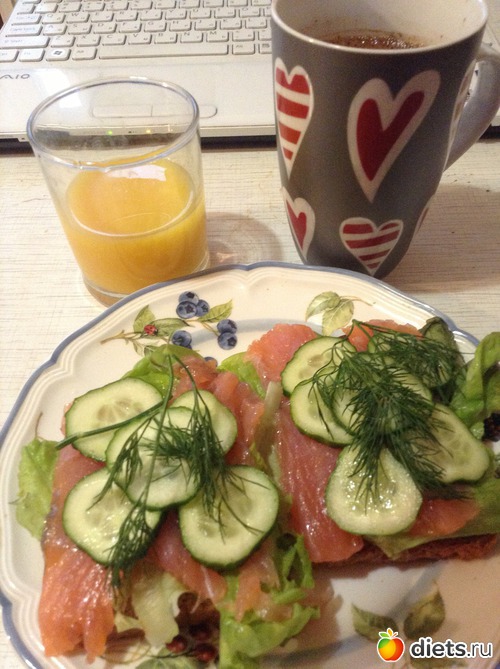 Завтрак - тосты с семгой и овощами, сок, кофе: