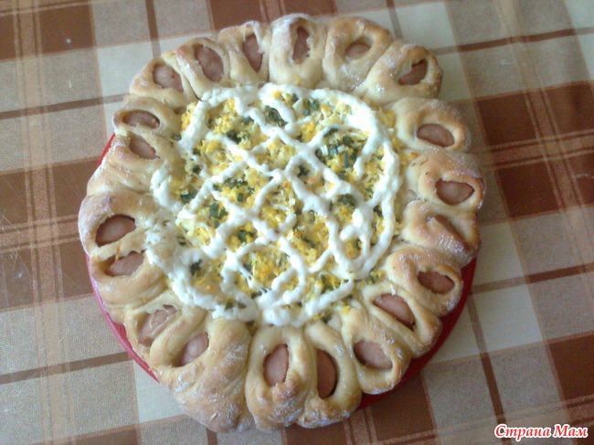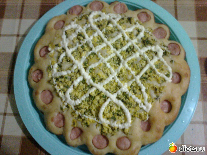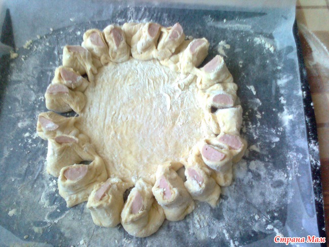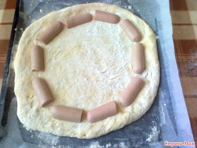 На противень постелить пергамент (бумагу для выпечки), положить один кусок теста, руками сформировать круг. По краям уложить четвертинки сосисок.